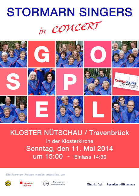 Die Stormarn Singers, werden im Mai 2014 wieder zu Gast im Kloster Nütschau sein. Sehr gern folgen wir der Einladung der Benediktinermönche, wieder ein Konzert in den wunderschönen Räumen des Klosters zu geben. Diesen besonderen Ort der Stille und des Gebets mit authentisch gesungenen Gospels zu füllen, ist für uns immer wieder eine intensive Erfahrung, die wir gerne mit unserem Publikum teilen. Die Lebendigkeit, aber auch das In-sich-gehen beim Singen des Evangeliums wird durch die Atmosphäre des Klosters weiter getragen.