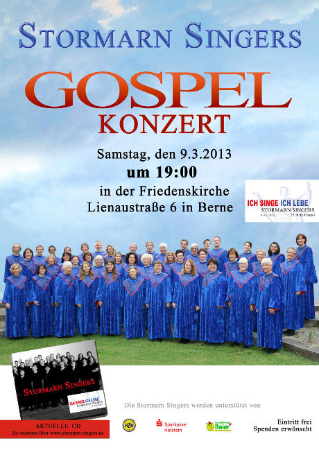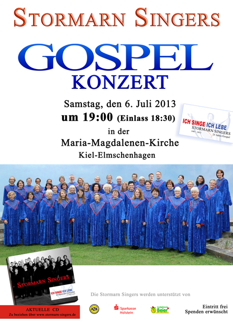 Die Stormarn Singers sind am 6. Juli 2013 erstmals zu Gast in Kiel. In der Maria-Magdalenen-Kirche in Elmschenhagen möchten wir unsere Gäste begeistern und mit Ihnen einen wunderschönen Gospelabend erleben.
