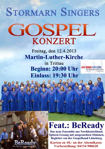 Die Stormarn Singers sind erneut in der Trittauer Martin-Luther-Kirche zu Gast. Gemeinsam mit „BeReady“ werden sie dort am 12. April ab 20 Uhr eine kleine Gospelnight feiern.