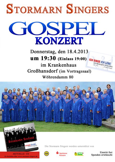 Ende März 2014 richten die Stormarn Singers einen offenen Gospel-Workshop mit Angelika Rehaag, Hanjo Gäbler und Eggo Fuhrmann im Waldreitersaal in Großhansdorf aus.